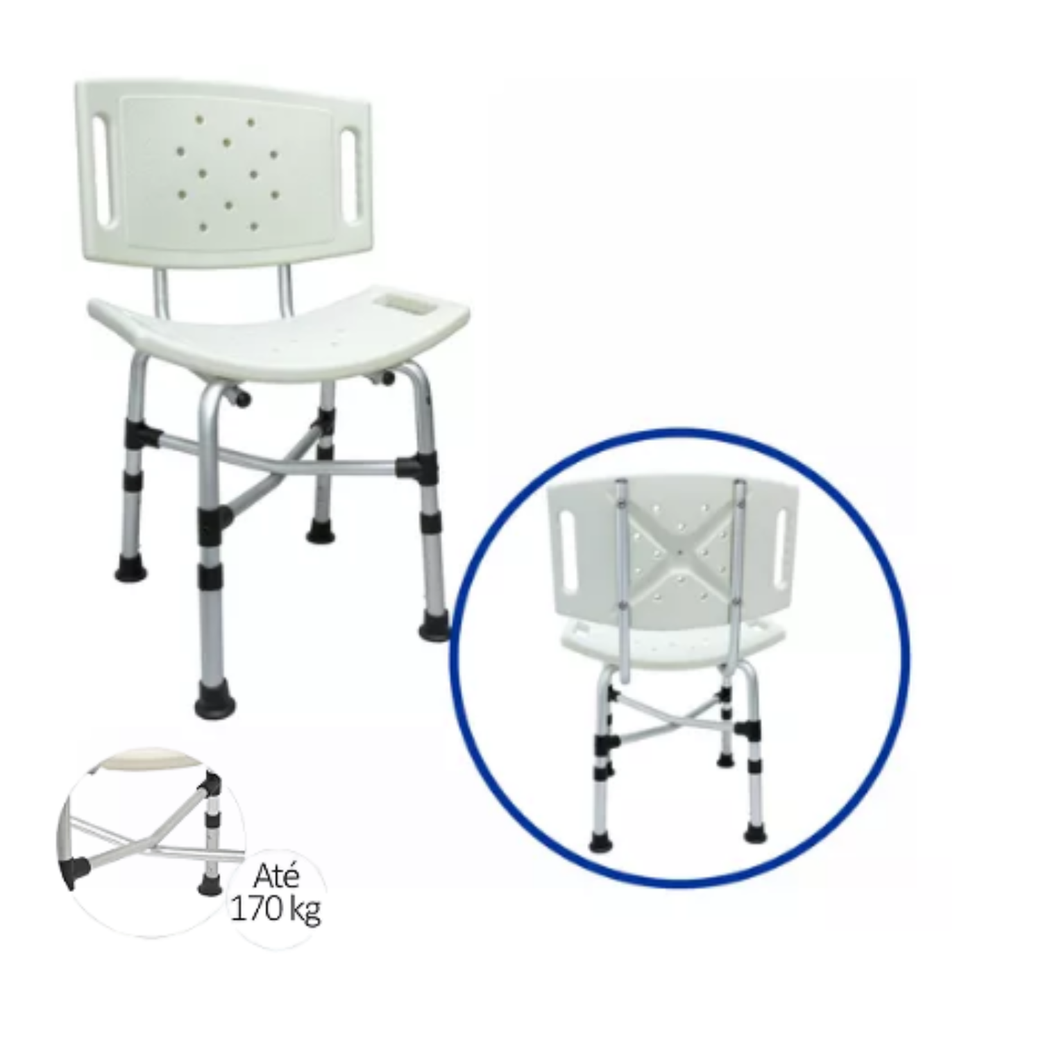 - Este banco para banho é confeccionado em alumínio anodizado resistente a ferrugem, com suporte em X nas pernas para maior estabilidade e resistência. Conta com quatro regulagens de altura, sendo muito útil no dia a dia de pessoas que precisam de um maior suporte, com problema de equilíbrio ou que queiram evitar acidentes no banheiro. É leve e fácil para transportar para onde precisar.