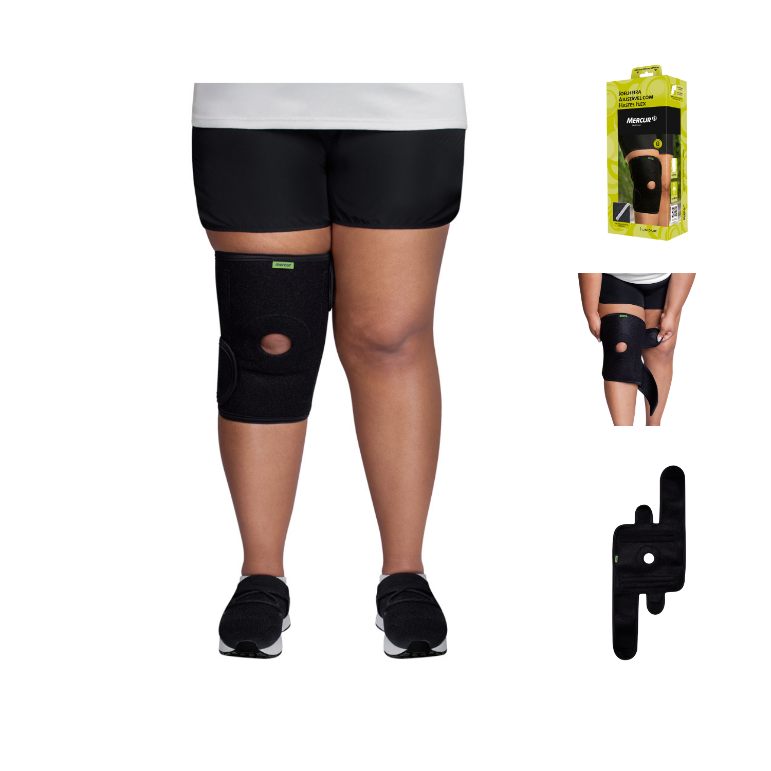 Possui suportes metálicos flexíveis para estabilização da região do joelho e orifício reforçado que centraliza a patela. O produto possui cintas ajustáveis através de fechos aderentes, proporcionando uma compressão adequada na região, e é confeccionado em Neoprene®, que retém o calor corporal, auxiliando na redução da dor e prevenção de lesões. Pode ser usada tanto no joelho direito quanto no esquerdo.